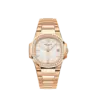 Dial: Silvery opaline (white) lacquered dial featuring the signature Nautilus wave pattern, with applied rose-gold hour markers and Arabic numerals coated in luminescent white.